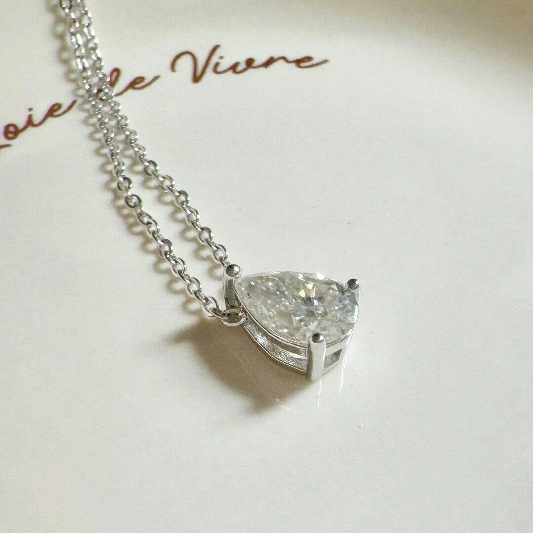 The Celeste Necklace features a brilliant pear-cut moissanite stone, symbolizing everlasting love and elegance. It's crafted for those who want meaningful, luxurious jewelry without the high diamond price tag.
